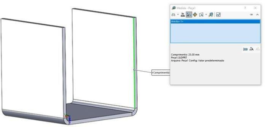 Agora, observe que ao gerar o detalhamento das medidas, é possível presumir, inicialmente, que o comprimento lateral da chapa seria 75 (afinal de contas, 25 + 25 + 25 = 75), porém essa forma não considera nem a deformação e nem os raios que estão sendo inseridos.