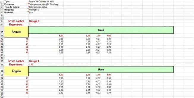 E quando estiver trabalhando com chapas metálicas, você pode selecionar a tabela de acordo com sua necessidade.
