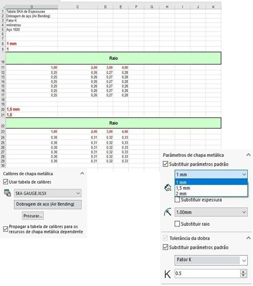 No SOLIDWORKS, é possível ir além de um Fator K estático e configurar tabelas que variam esse coeficiente de acordo com o calibre da chapa, raio de dobra e ângulo aplicado.
